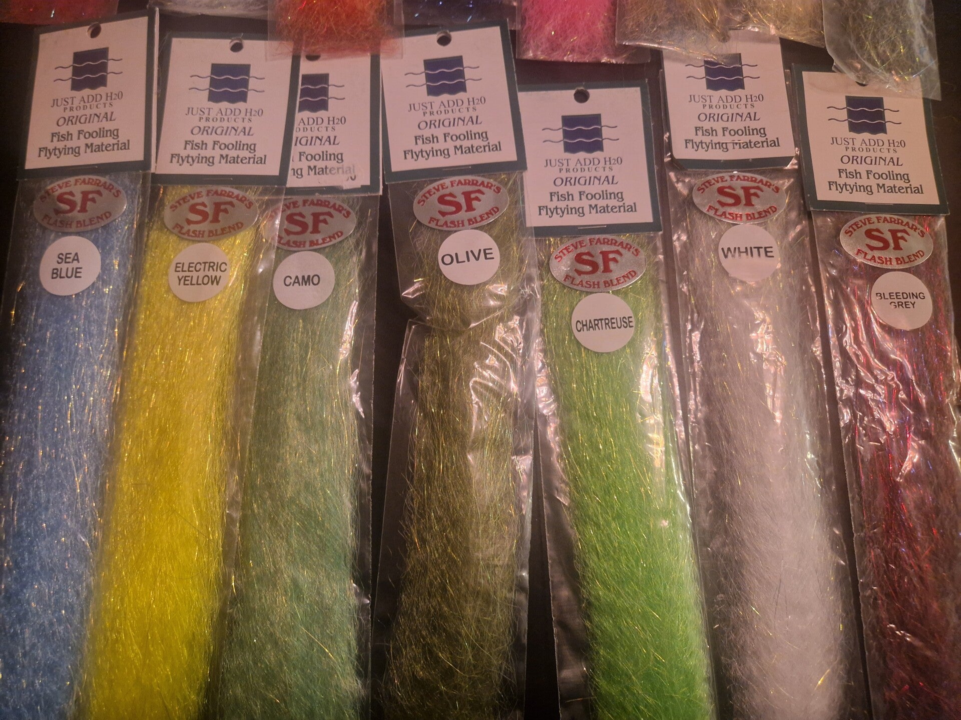 Steve Farrar SF Blend was developed by USA fly tyer, Steve Farrar and is unique in the fact that it is already tapered and you can tie a fly using only the SF Blend. This material is a perfect blend of our Slinky Fibre and Slinky Blend range with a fine mylar flash. The BLEEDING colours incorperate a red and wisteria colour flash. The MIDNIGHT,VIOLET NIGHT, PEACOCK and HERRING BACK have a wisteria (dark blue/green). The rest of the colours have a pearl colour flash blended in. UV flash can also be incorporated into any colour from this range.