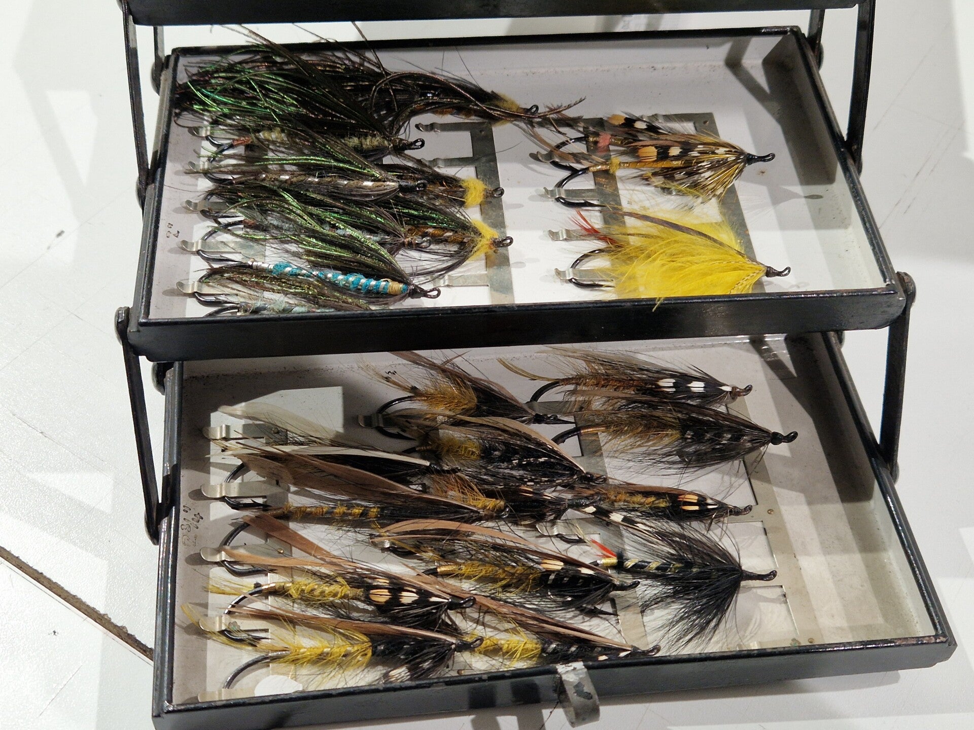 Farlow cantilever fly box met een 50 tal zalm vliegen.